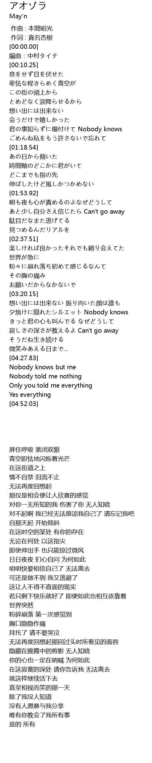 | [04:29.76] | Nobody knows but me |