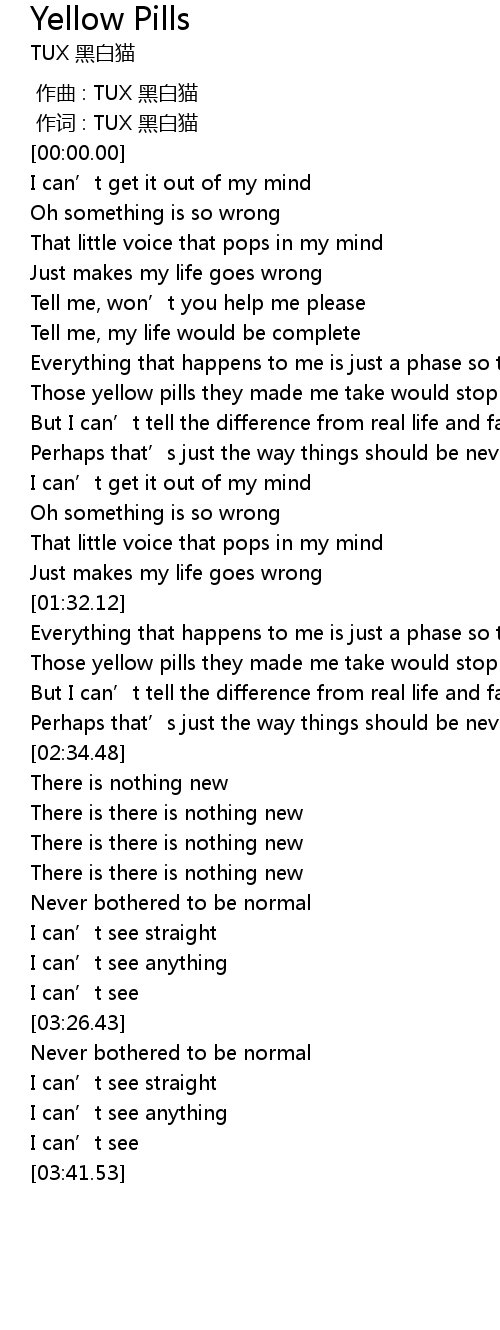 | [00:53.33] | Those yellow pills they made me take would stop me from being so silly |