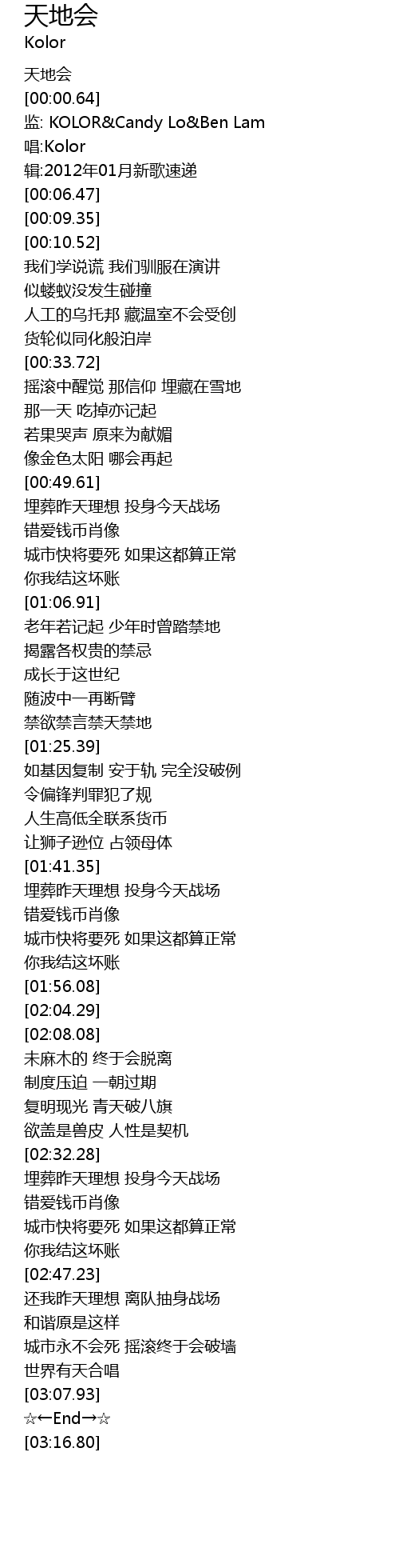 | [00:03.84] | 监: KOLOR&Candy Lo&Ben Lam |