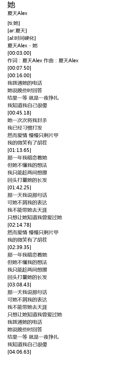 | [00:04.50] | 作词:夏天Alex 作曲:夏天Alex |