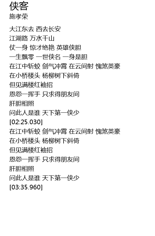 | [01:36.910] | 在江中斩蛟 剑气冲霄 在云间射 愧煞英豪 |