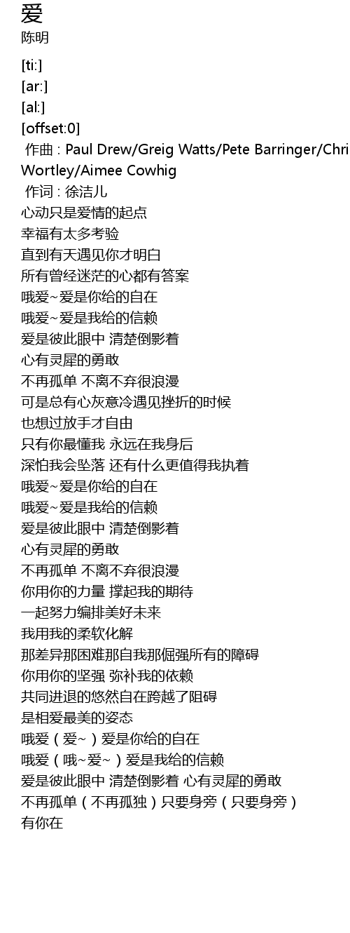 | [00:00.00] | 作曲 : Paul Drew/Greig Watts/Pete Barringer/Christopher Wortley/Aimee Cowhig |