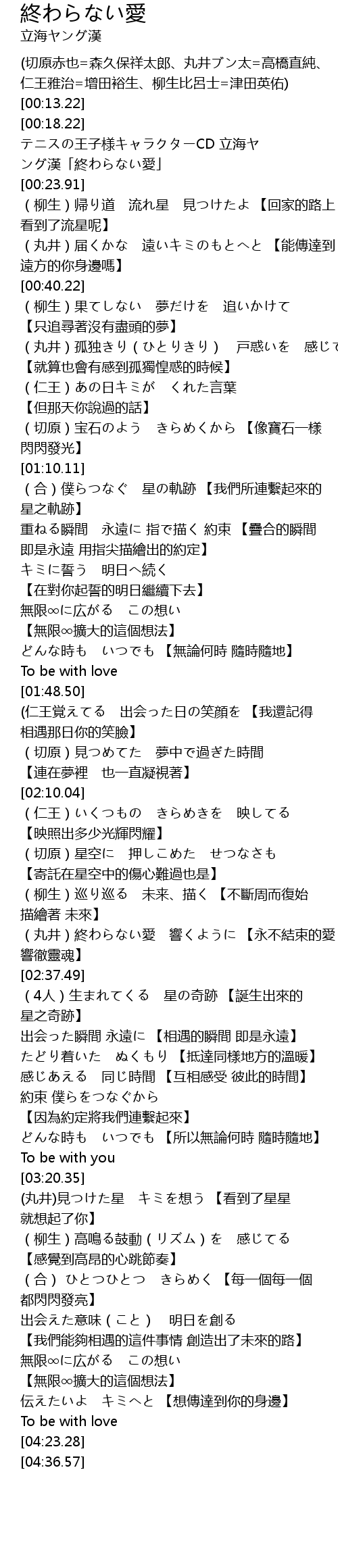 | [00:20.22] | テニスの王子様キャラクターCD 立海ヤ ング漢「終わらない愛」 |