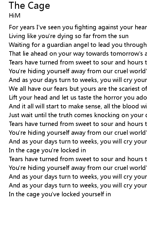 And as your days turn to weeks, you will cry yourself to sleep in the cage |