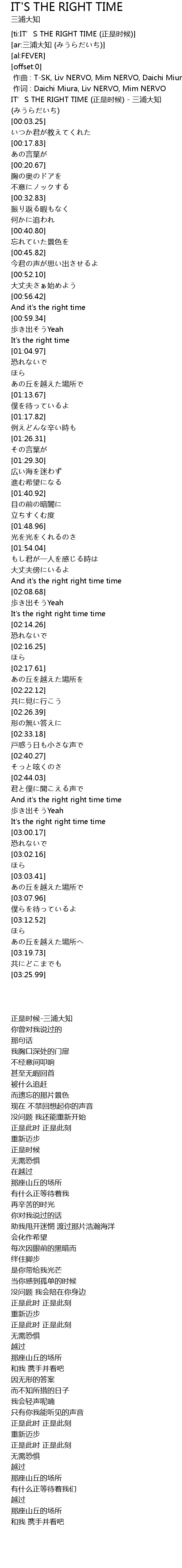 | [00:00.27] | IT’S THE RIGHT TIME (正是时候) - 三浦大知 (みうらだいち) |