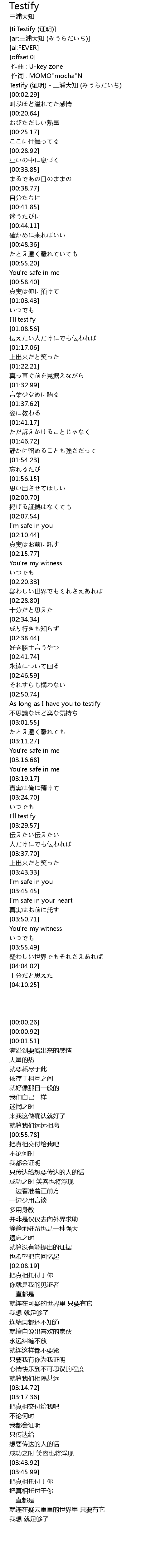 | [00:00.26] | Testify (证明) - 三浦大知 (みうらだいち) |