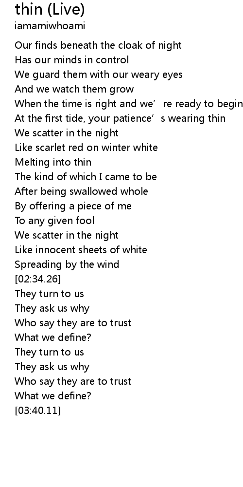 | [01:22.07] | At the first tide, your patience’s wearing thin |