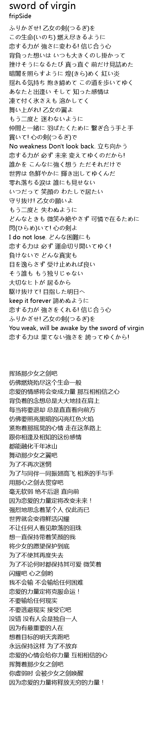 | [00:12.56] | ふりかざせ! 乙女の剣(つるぎ)を |
