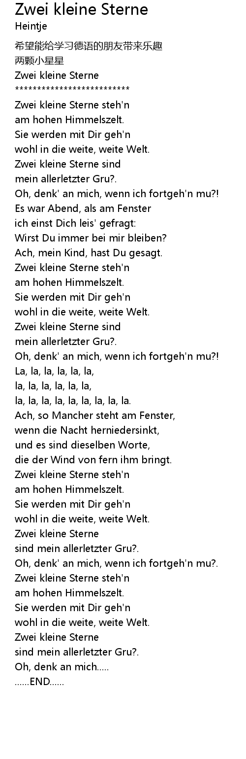 | [00:03.37] | Zwei kleine Sterne steh' n |