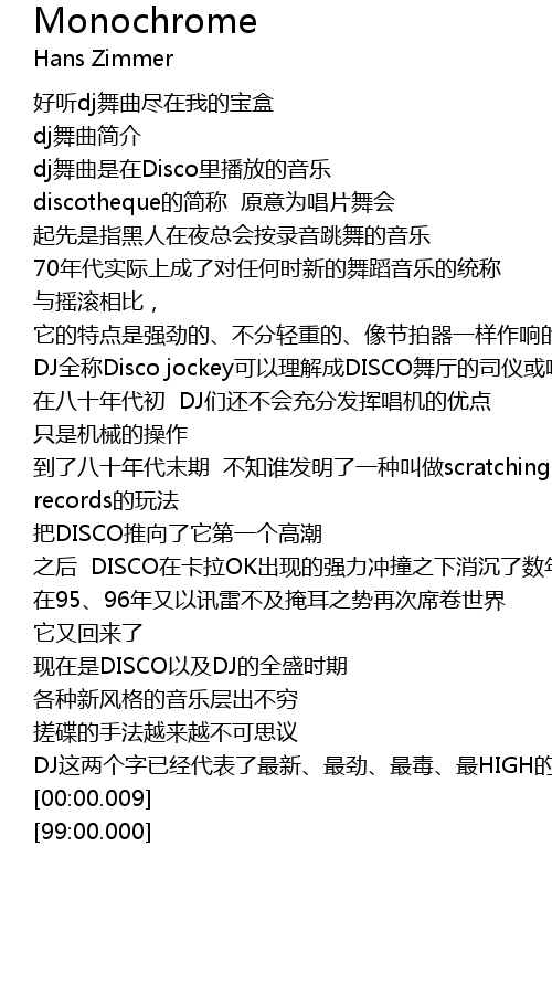 | [01:32.39] | dj舞曲是在Disco里播放的音乐 |