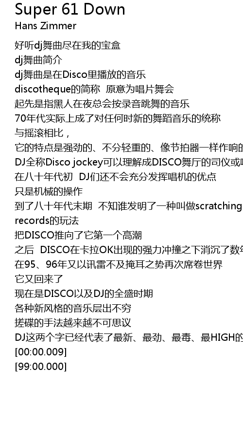 | [02:49.19] | DJ quán chēng Disco jockey kě yǐ lǐ jiě chéng DISCO wǔ tīng de sī yí huò chàng piān qí shì |