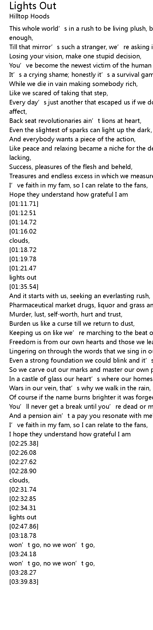 | [03:38.59][03:28.27][03:07.45] | Till it' s lights out |
