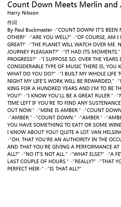 | By Paul Buckmaster " COUNT DOWN! IT' S BEEN MANY MOONS SINCE WE' VE LAST SEEN EACH OTHER!" " ARE YOU WELL?" " OF COURSE, AM I NOT ALWAYS WELL?" " GREAT, JUST GREAT!" " THE PLANET WILL WATCH OVER ME. NOW TELL ME OF YOURSELF, WAS YOUR JOURNEY PLEASANT?" " IT HAD ITS MOMENTS." " AND YOUR MUSICAL STUDIES, DO THEY PROGRESS?" " I SUPPOSE SO, OVER THE YEARS I' VE BEEN INTO JUST ABOUT EVERY CONSIDERABLE TYPE OF MUSIC THERE IS, YOU KNOW." " MM, SPLENDID." " BLINK? SMALL? WHAT DO YOU DO?" " I BUILT MY WHOLE LIFE TO SEE YOU CROWNED, KING. TOMORROW NIGHT MY LIFE' S WORK WILL BE REWARDED," " LOOK AT THE THRONE! A PEOPLE WITHOUT A KING FOR A HUNDRED YEARS AND I' M TO BE THE HEIR OF THE THRONE. DIDN' T I TELL YOU?" " I KNOW YOU' LL BE A GREAT RULER." " NOW, COUNT DOWN, THERE' S NOT MUCH TIME LEFT IF YOU' RE TO FIND ANY SUSTENANCE BEFORE THE PARTY, YOU REALLY MUST GO OUT NOW." " MINE IS AMBER." " COUNT DOWN." " MY NAME IS AMBER." " COUNT DOWN." " AMBER." " COUNT DOWN." " AMBER." " AMBER, WHAT DO YOU KNOW ABOUT ME?" " WON' T YOU HAVE SOMETHING TO EAT? OR SOME WINE?" " NO, THANK YOU." " LET' S SEE, WHAT DO I KNOW ABOUT YOU? QUITE A LOT. VAN HELSING' S TALKED ABOUT YOU A GREAT DEAL." " OH, THAT YOU' RE AN AUTHORITY IN THE OCCULT, THAT YOU' RE HERE TO OPEN A MUSEUM AND THAT YOU' RE GIVING A PERFORMANCE AT THE PREVIEW THIS EVENING." " IS THAT ALL?" " NO IT' S NOT ALL." " WHAT ELSE?" " A FEW THINGS I' VE LEARNT MYSELF IN THE LAST COUPLE OF HOURS." " REALLY?" " THAT YOU' RE CHARMING, ATTRACTIVE, THE PERFECT HEIR" " IS THAT ALL?" |