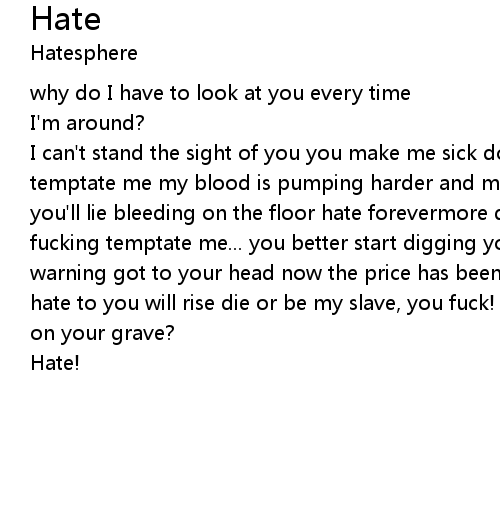 | I can't stand the sight of you you make me sick don't come near me don't you temptate me my blood is pumping harder and my hate is growing stronger soon you'll lie bleeding on the floor hate forevermore don't come near me don't you fucking temptate me... you better start digging you better start dying no warning got to your head now the price has been paid just now you realize my hate to you will rise die or be my slave, you fuck! can't you see the scriptures on your grave? | |