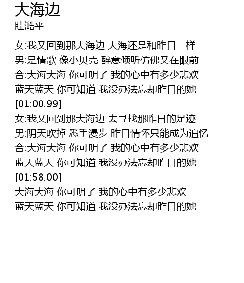 | [00:12.25] | 女:我又回到那大海边 大海还是和昨日一样 |