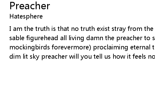 | I am the truth is that no truth exist stray from the penitential path of the sable figurehead all living damn the preacher to see (his horizon circled by mockingbirds forevermore) proclaiming eternal truths and solemnly pointing at dim lit sky preacher will you tell us how it feels not being alive? |