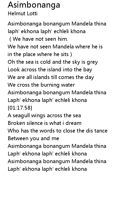 | [01:03.42] | Asimbonanga bonangum Mandela thina |