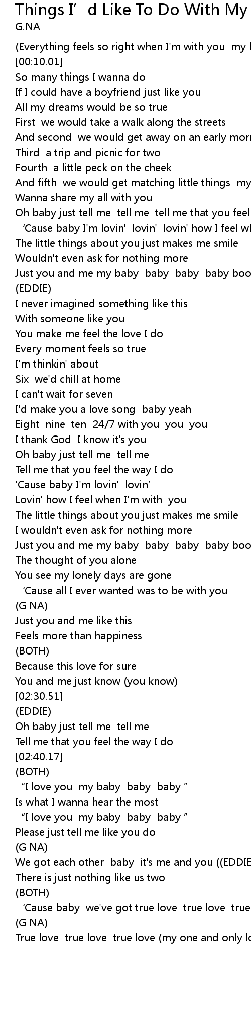 | [00:48.38] | Oh baby just tell me tell me tell me that you feel the way I do |