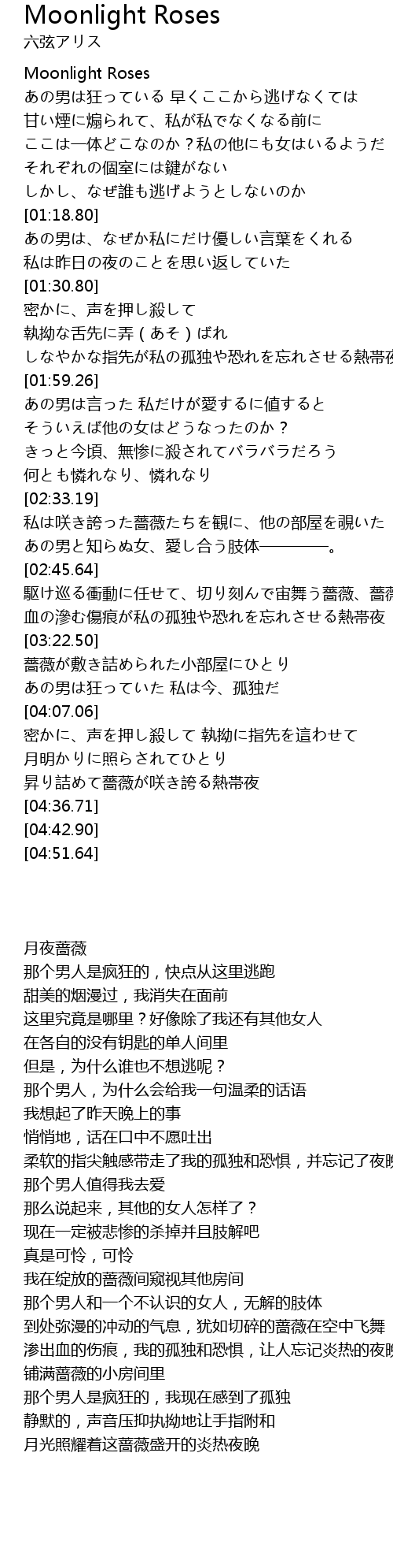 | [04:21.08] | 月明かりに照らされてひとり 昇り詰めて薔薇が咲き誇る熱帯夜 |
