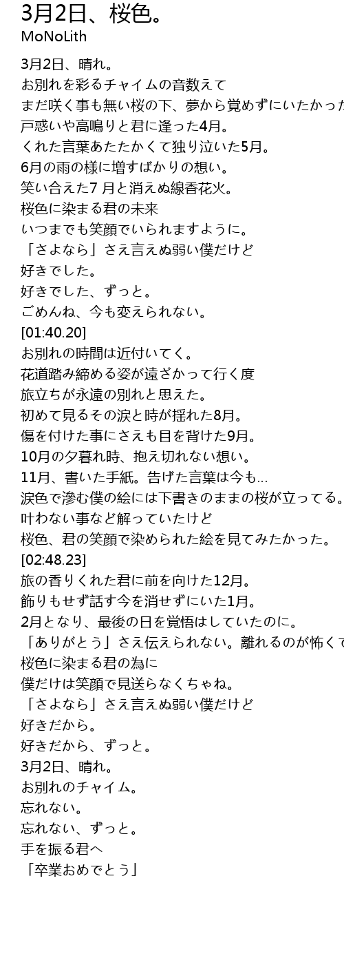 | [02:39.73] | 桜色、君の笑顔で染められた絵を見てみたかった。 |