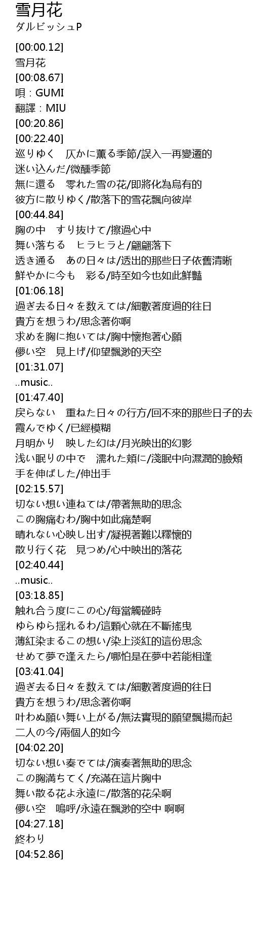 | [00:42.12] | 彼方に散りゆく/散落下的雪花飄向彼岸 |
