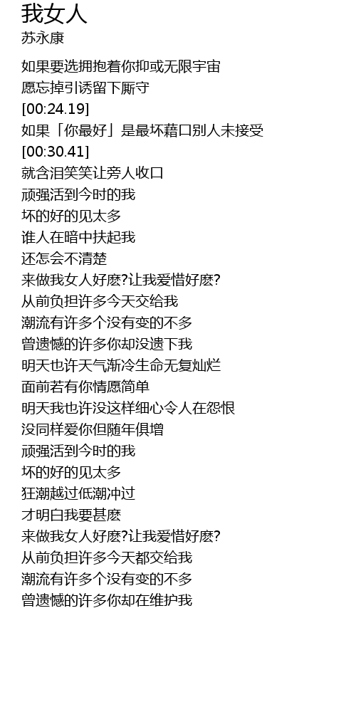 | [00:54.00] | 来做我女人好麽?让我爱惜好麽? |