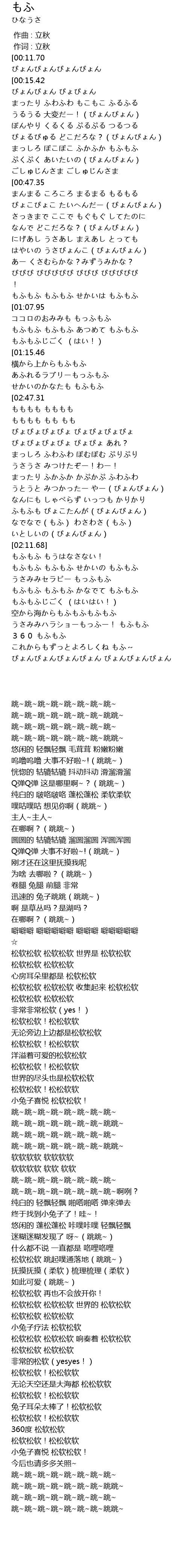 | [01:00.42][01:07.95][02:22.91][02:30.46] | もふもふ もふもふ |