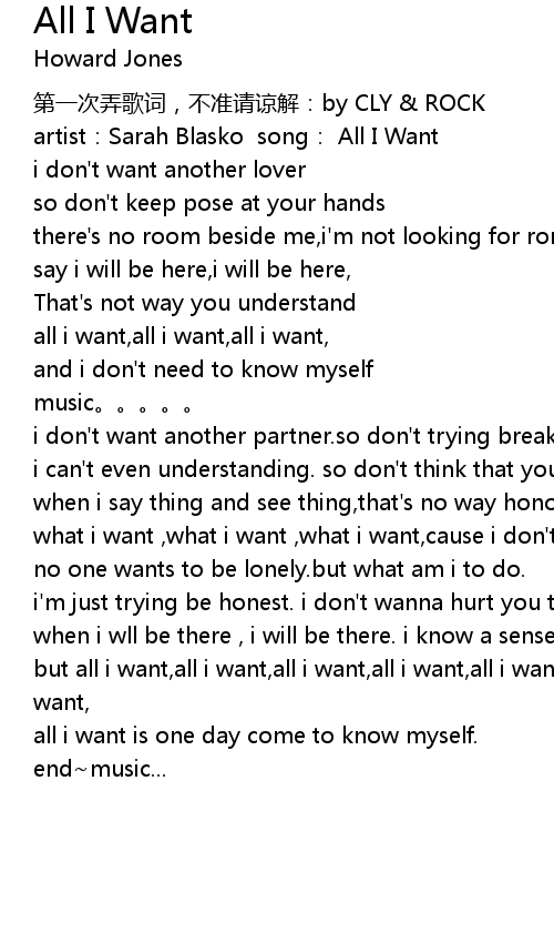 | [02:43.77] | but all i want, all i want, all i want, all i want, all i want, say all i want, |