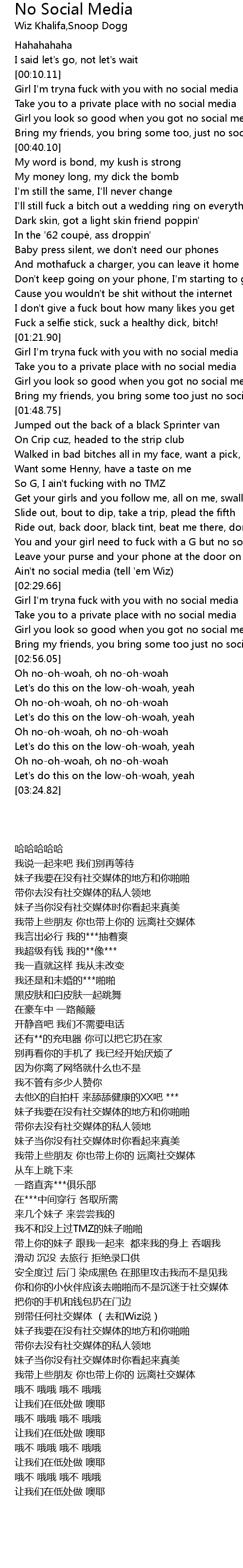 | [01:22.25] | Girl I'm tryna fuck with you with no social media |