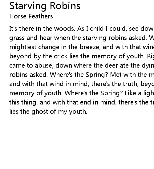 It's there in the woods. As I child I could, see down where the deer ate dying grass and hear when the starving robins asked. Where's the Spring? Met with the mightiest change in the breeze, and with that wind in mind, there's the truth, beyond by the crick lies the memory of youth. Right out of the blue, a frost came to abuse, down where the deer ate the dying grass, near where the starving robins asked. Where's the Spring? Met with the mightiest change in the breeze and with that wind in mind, there's the truth, beyond by the crick lies the memory of youth. Where's the Spring? Like a light is to dark there's an end to this thing, and with that end in mind, there's the truth, beyond by the crick lies the ghost of my youth. |