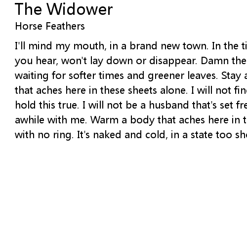 I'll mind my mouth, in a brand new town. In the time of the year when the things you hear, won't lay down or disappear. Damn the winter, it's following me. I'm waiting for softer times and greener leaves. Stay awhile with me. Warm a body that aches here in these sheets alone. I will not find another of your kind, I hold this true. I will not be a husband that's set free, I said I do. Stay awhile with me. Warm a body that aches here in these sheets alone. Hold a hand with no ring. It's naked and cold, in a state too shocked to be old. |