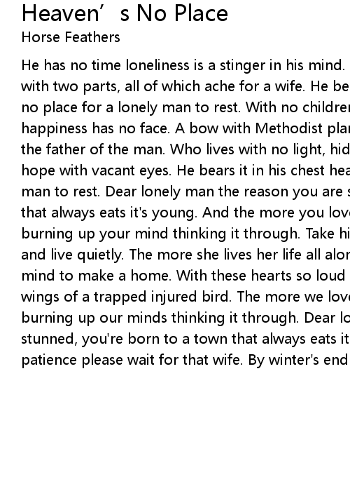 He has no time loneliness is a stinger in his mind. A mind with two hearts, each with two parts, all of which ache for a wife. He bears it in his chest heaven's no place for a lonely man to rest. With no children abreast, no peace to taste, happiness has no face. A bow with Methodist plans that fail him by day, became the father of the man. Who lives with no light, hid by the night, poisoned by hope with vacant eyes. He bears it in his chest heaven's no place for a lonely man to rest. Dear lonely man the reason you are stunned, you're born to a town that always eats it's young. And the more you love a lie it's coming true, your burning up your mind thinking it through. Take his name, Marie. Bear him a child and live quietly. The more she lives her life all alone. It's burning up her mind to make a home. With these hearts so loud their beating's heard. Like the wings of a trapped injured bird. The more we love a lie it's coming true. It's burning up our minds thinking it through. Dear lonely man the reason you are stunned, you're born to a town that always eats it's young. With a pious patience please wait for that wife. By winter's end you may come back to life. |