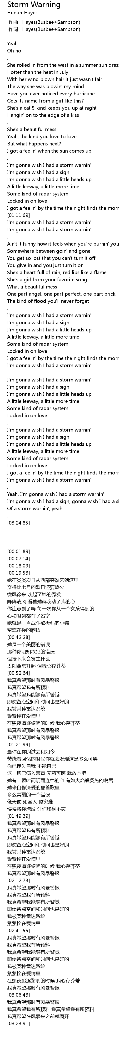 | [03:19.89] | Of a storm warnin', yeah |