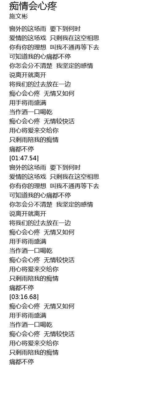 | [03:30.97] | 痴心会心疼 无情又如何 |