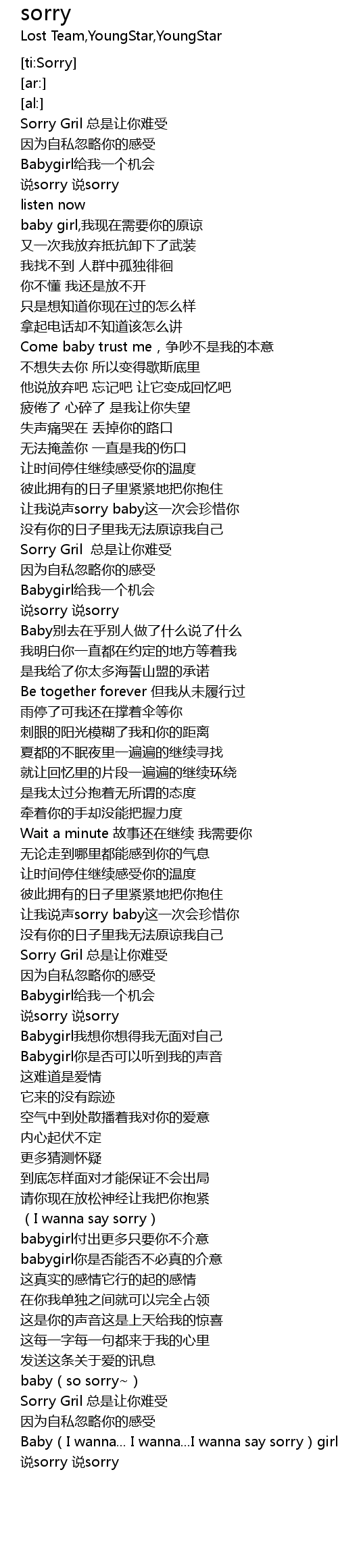 | [03:34.80] | Baby I wanna... I wanna... I wanna say sorry girl gei wo yi ge ji hui |