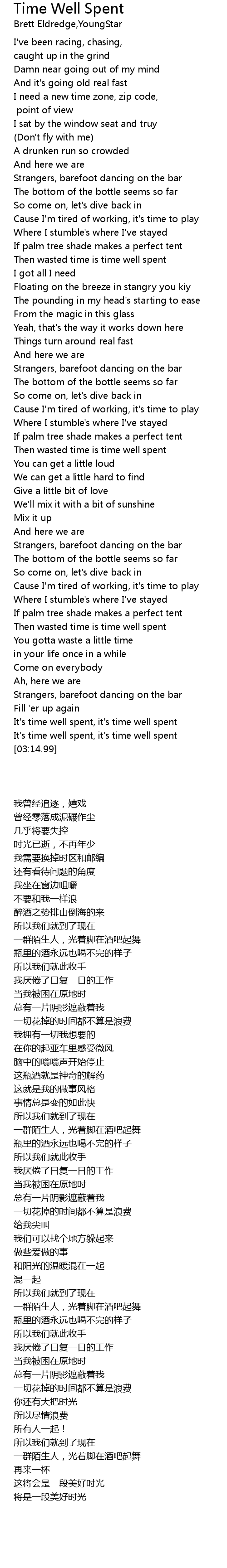 | [01:37.00] | Strangers, barefoot dancing on the bar |