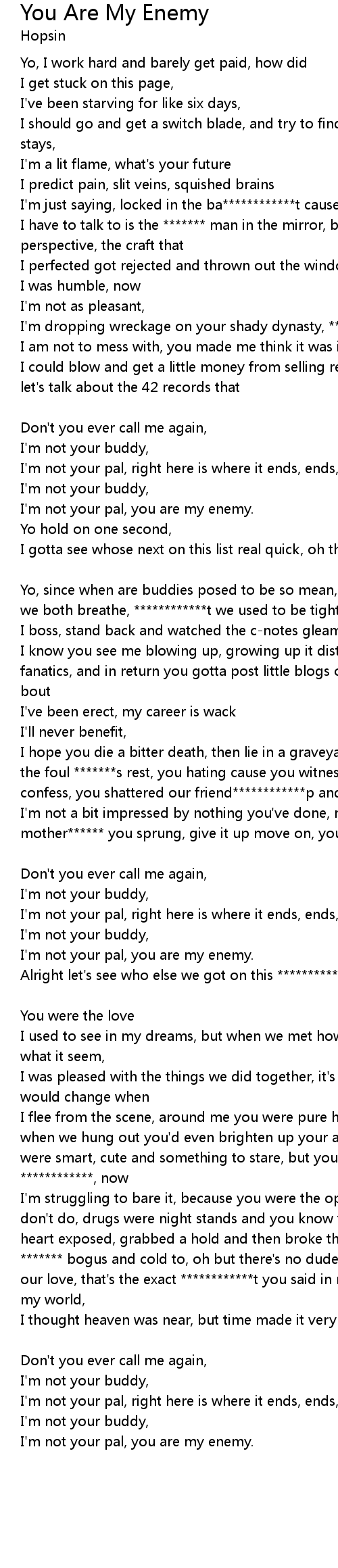| Yo, since when are buddies posed to be so mean, they must be hating the air that we both breathe, ************t we used to be tighter than emo jeans, the day | |