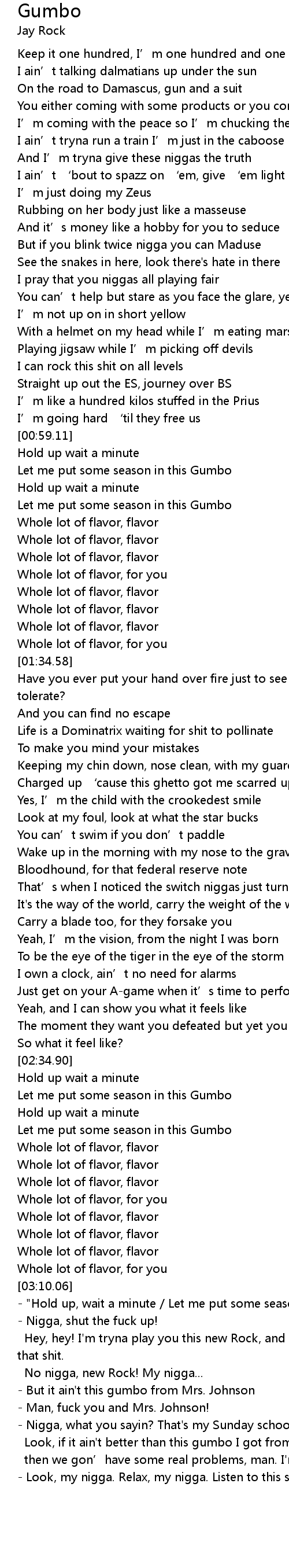 | [03:24.56] | - "Hold up, wait a minute / Let me put some season in this gumbo" |