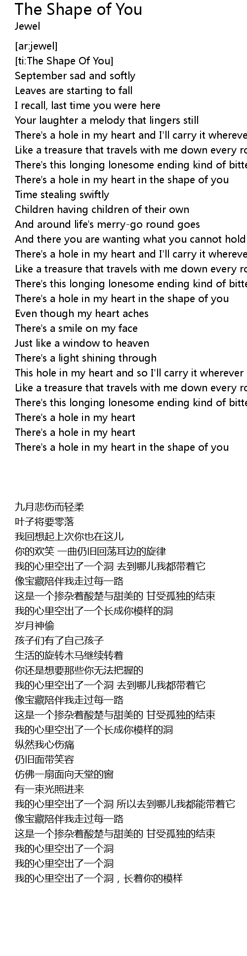 [02:17.87] There's a hole in my heart in the shape of you