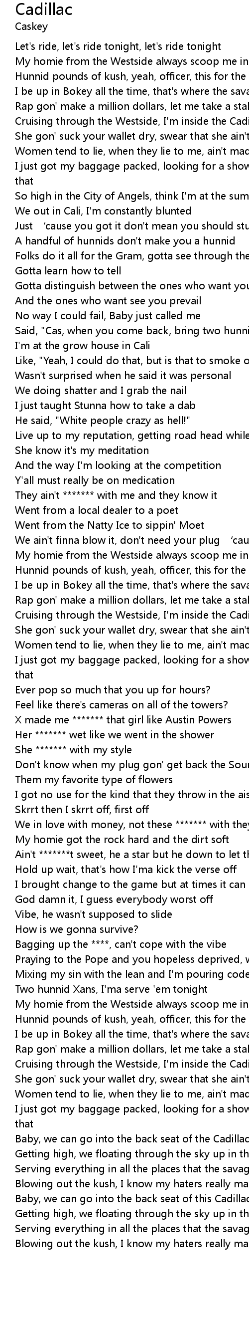 | [02:55.14] | My homie from the Westside always scoop me in his Cadillac |