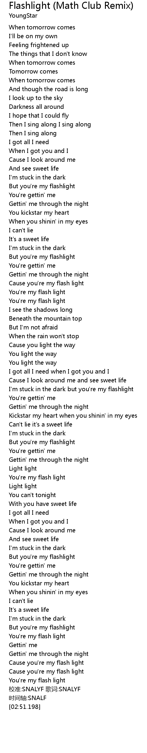 | [01:32.941] | I'm stuck in the dark but you're my flashlight |