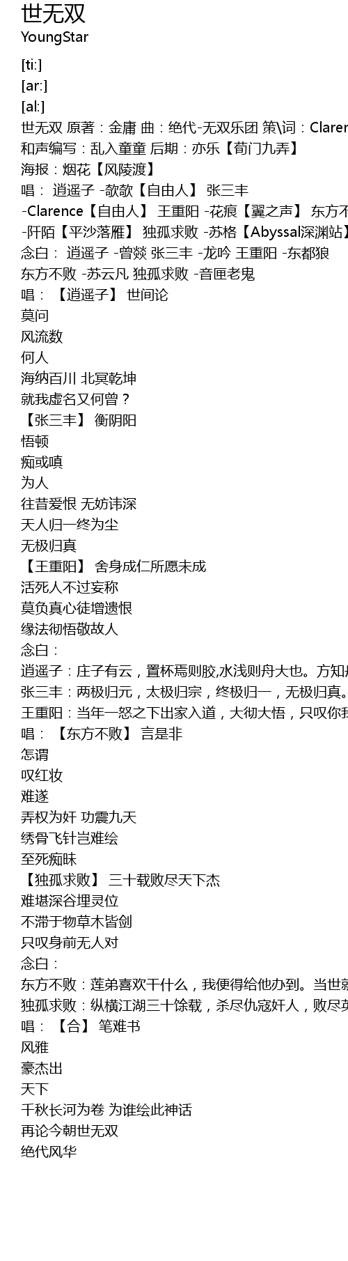 | [00:00.00] | 世无双 原著:金庸 曲:绝代-无双乐团 策\词:Clarence 和声编写:乱入童童 后期:亦乐【荀门九弄】 海报:烟花【风陵渡】 |