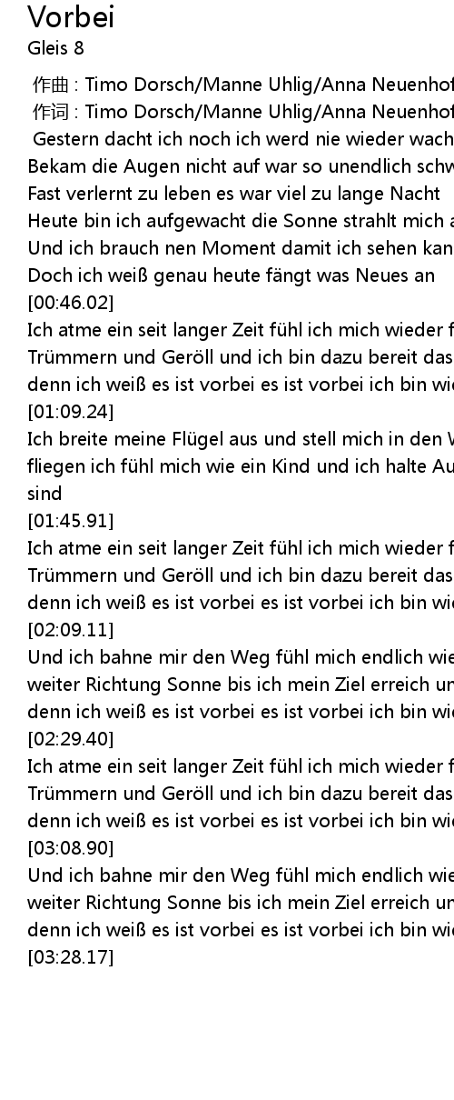 | [03:09.37] | Und ich bahne mir den Weg fü hl mich endlich wieder leicht laufe weiter Richtung Sonne bis ich mein Ziel erreich und ich blicke nicht zurü ck denn ich wei es ist vorbei es ist vorbei ich bin wieder frei |
