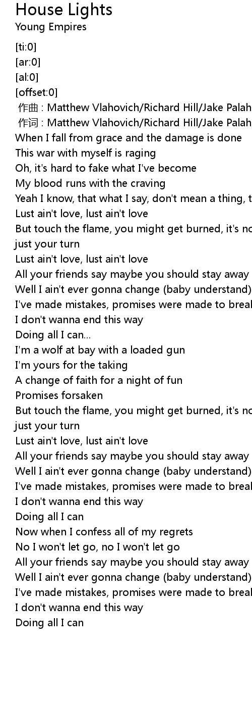 | [00:41.09] | But touch the flame, you might get burned, it's not your fault, it's just your turn |