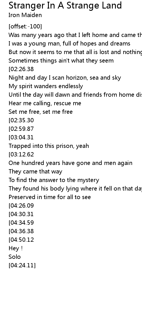 | [01:50.54][02:59.87][04:41.39][04:58.68][05:15.54] | Stranger in a strange land |