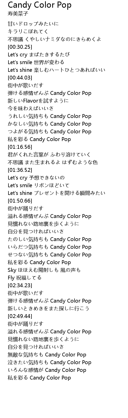 | [02:38.16] | 弾ける感情ぜんぶ Candy Color Pop |