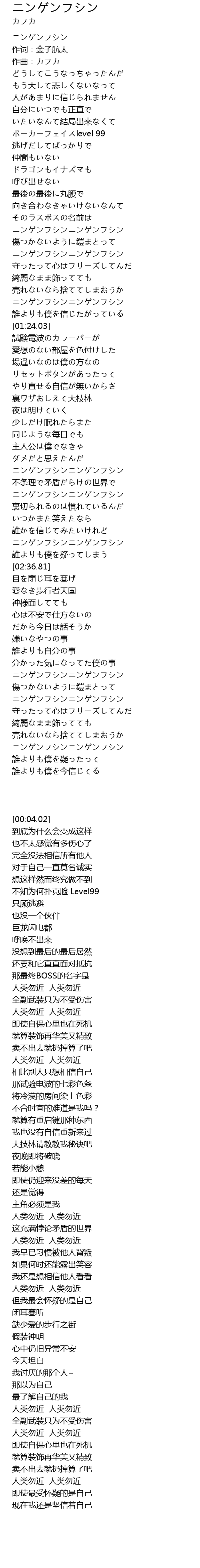 | [01:02.11] | ニンゲンフシンニンゲンフシン |