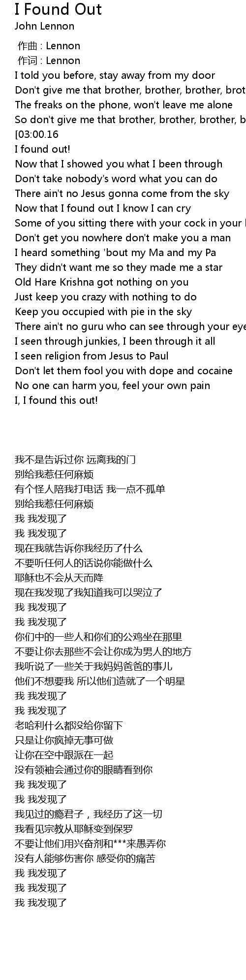 | [03:10.88][03:00.16][02:33.80][02:28.52][01:38.08][01:32.65][01:05.81][01:00.47][00:33.64][00:28.10] | I, I found out! |