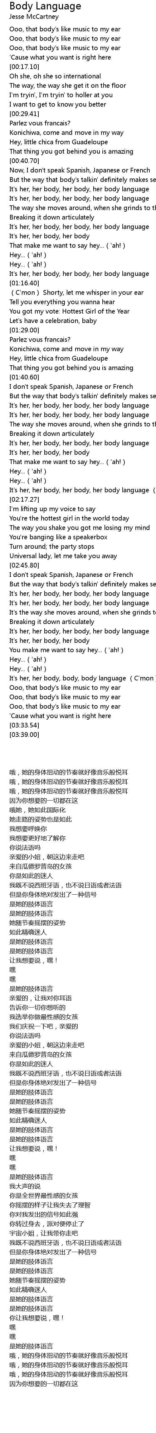 | [03:18.27] | It' s her, her body, body, body language C' mon |