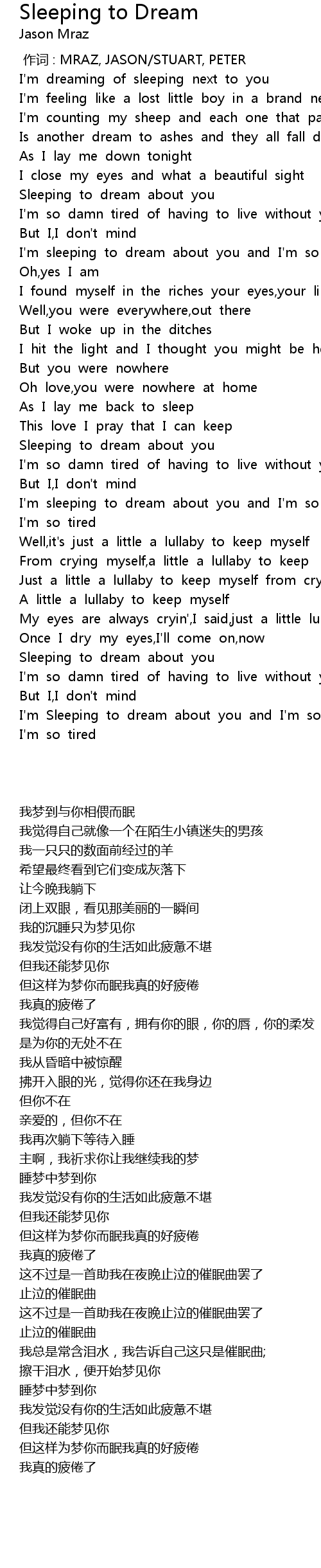 | [02:18.529] | I' m sleeping to dream about you and I' m so tired |
